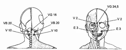 С закрытыми глазами, установив большие пальцы на точки «VB 20», наклоняем голову назад, одновременно сильно нажимая зону под основанием черепа примерно две минуты подряд. Дыхание глубокое.