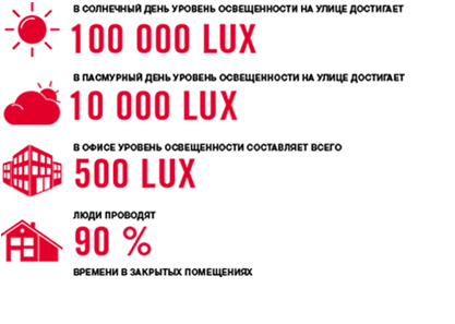 Естественный дневной свет является наиболее благоприятным для человека. Соотношение солнечного света и голубого неба, а также изменение яркости света и его цветовой температуры в течение дня оказывают мощное положительное воздействие на наш гормональный фон. К сожалению, в современном мире человек почти не видит дневного света, так как большую часть времени проводит в закрытых помещениях.