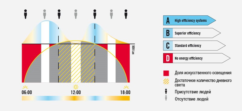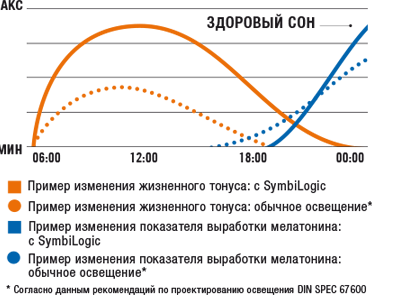 Например технология Symbilogic ( основные элементы которой представлены на рынке) позволяет оптимальным образом сочетать наиболее благоприятное для людей освещение и преимущества интеллектуальных систем управления. Она обеспечивает биологически активное освещение, процессы которого специально оптимизированы для офисных помещений. В первой половине дня динамичное увеличение яркости света и доли синего цвета оказывает активизирующее и стимулирующее воздействие. В полдень оба показателя снижаются, а затем вновь резко идут вверх, помогая побороть усталость, которая обычно приходит во второй половине дня. Таким образом SymbiLogic помогает человеку преодолевать сложные фазы, не теряя концентрации и поддерживая высокую работоспособность. Ближе к вечеру SymbiLogic автоматически приглушает освещение, приближая его к теплому белому диапазону, чтобы постепенно подготовить наш организм к ночному отдыху. Так, благодаря инновационной системе управления SymbiLogic обеспечивает здоровый сон и помогает восстанавливать силы, придавая заряд бодрости на весь день и помогая укрепить здоровье.