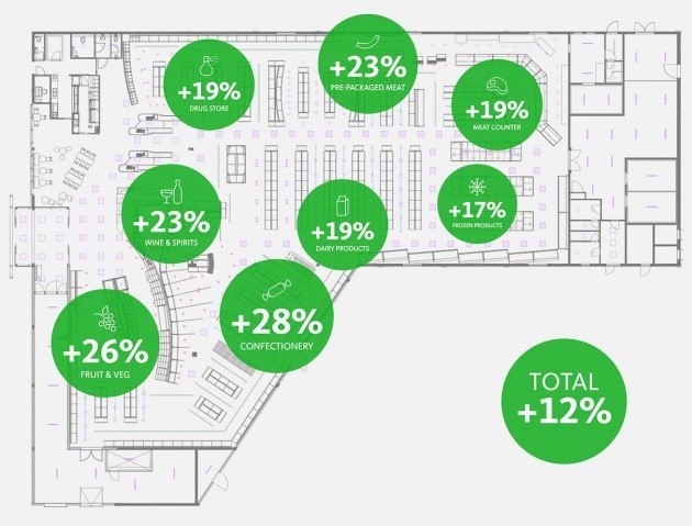 Испытание технологии в магазине Edeka в Нижней Саксонии показало, что общий объем продаж увеличился на 12 процентов по сравнению с ближайшим эталонным магазином. При этом продажи кондитерских изделий выросли на 28 процентов, фруктов и овощей на 26 процентов, вина и спиртных напитков - на 23 процента и фасованное мясо на 23 процента.