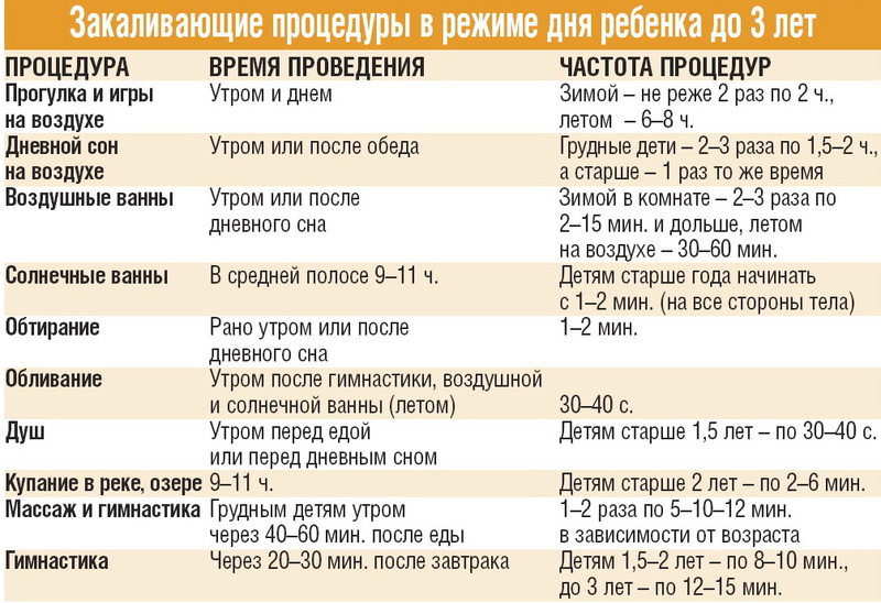 Для детей старше года температура воздуха при воздушных ваннах (если открыть окно в комнате) составляет 18–19°С, в возрасте от 3 до 6 лет она снижается до 16°С. Во время воздушной ванны дети должны находиться в движении. Ранней весной маленьких детей можно выносить на воздух, начиная с 2–3-недельного возраста: сначала два, а затем три раза в день.