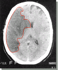 Выделенный фрагмент - обширный участок пониженной плотности ткани мозга - результат тяжелого повреждения, вызванного тромбозом сонной артерии.