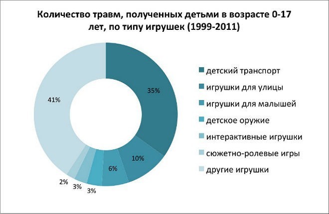 В соответствии с данными статьи, опубликованной недавно в журнале Clinical Pediatrics, около 150 тысяч детей в Америке ежегодно госпитализируют с травмами, полученными из-за игрушек (по России такой статистики, к сожалению, нет). Авторы статьи, обработав данные, собранные в клиниках за более чем 20 лет, выяснили, что наиболее опасными для детей являются скутеры, самокаты, скейтборды, электрокары и другие игрушки на колесах.