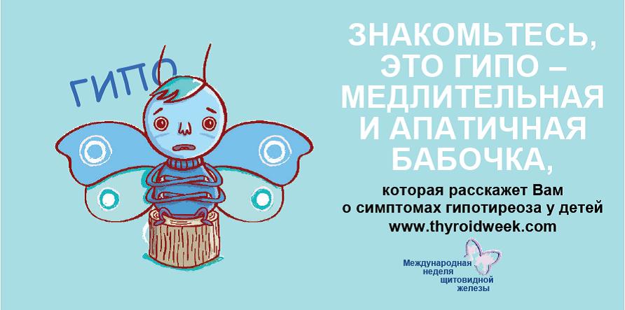 · В мае 2016 г. прошла Международная неделя щитовидной железы. В этом году образовательная кампания направлена на повышение осведомленности населения о заболеваниях щитовидной железы у детей. Символом этой кампании стала бабочка, поскольку щитовидная железа по форме напоминает силуэт бабочки. Поймайте бабочку – обратите внимание на симптомы заболеваний щитовидной железы (ЩЖ).
